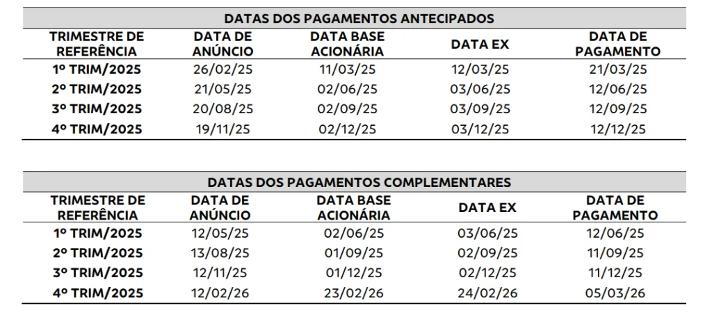 O BB remunerará os acionistas em oito fluxos, sendo quatro pagamentos realizados ao longo dos trimestres de referência, de forma antecipada, e outros quatro pagamentos complementares, efetivados após o encerramento dos trimestres de referência, conforme quadro abaixo: